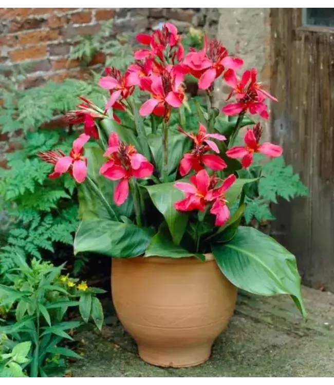 This dwarf canna will bring vibrant pink blooms to your midsummer garden atop bright green leaves . Perfect for your mixed containers with caladiums or begonias.