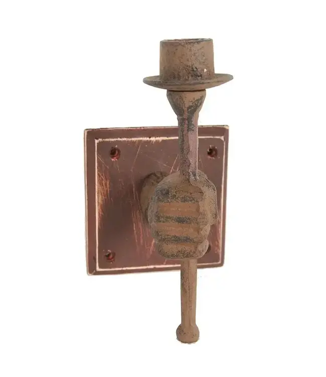 Add a touch of rustic charm and appeal to your home with this Wall Mount Iron Candle Holder. Features a unique design with distressed finish. Measures 4.3"L x 4.5"W x 8"H.