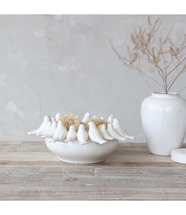 Whimsical white ceramic bowl adorned with sculpted birds perched around the rim, creating a serene and artistic centerpiece. Perfect on it's own, or great for a favorite plant!