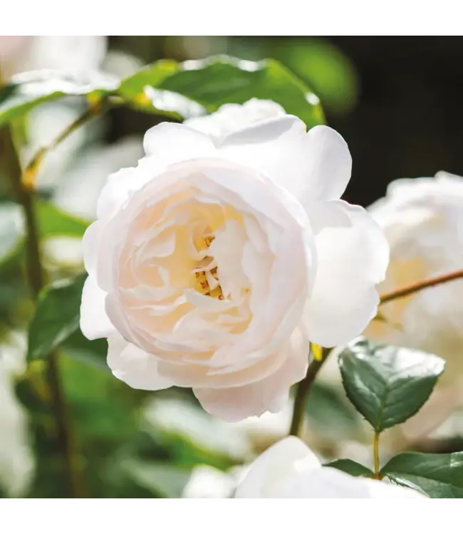Peachy-pink buds open to white chalice-shaped blooms with pink hints. Strong Old Rose fragrance with almond, cucumber, and lemon notes. Forms a neat, rounded, bushy shrub. Named for Shakespeare’s Desdemona.