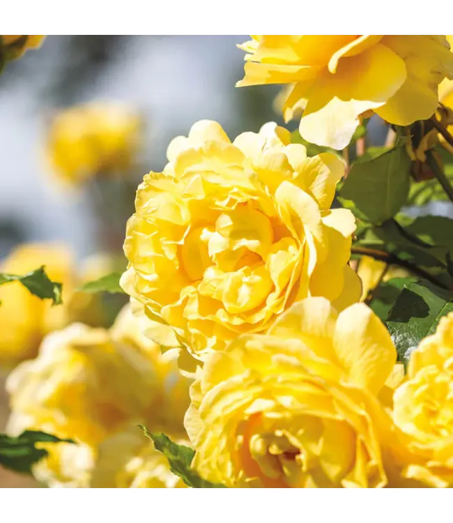 Bears rich yellow blooms that pale with time, with a neat outer ring enclosing inner petals. Strong, rich fragrance with a hint of lemon, growing sweeter with age. Forms a bushy, rounded shrub with arching branches and glossy foliage.